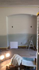 I was thrilled to be a part of this whole house project in the dining room! Gina and Laura with Vivid Interiors wanted to have wallpaper installed, but the shape and the niche in the dining room was going to make installation very difficult. They contacted me about doing a wall finish.